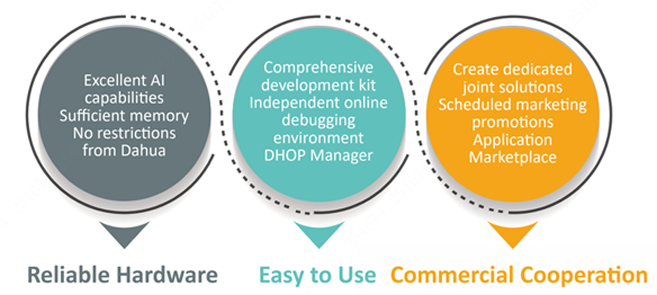 The Dahua Hardware Open Platform (DHOP) is an open application platform that allows third-party applications to be downloaded and installed on Dahua Network Cameras. It provides end-users with the right solutions to optimize their security or loT environment. Flexibility is also guaranteed as users can always remove existing applications and upload new solutions.