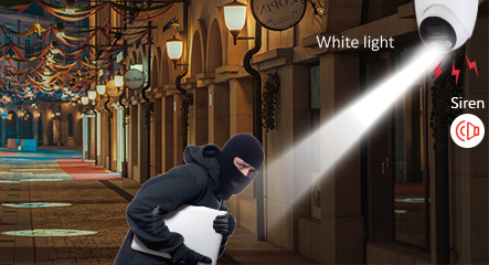 AI XVR (SMD Plus Feature) + Active Deterrence Camera When a person or vehicle intrudes the monitored scene, the SMD Plus feature identifies potential risk and sends alarm to the user immediately. At the same time, the active deterrence camera warns off the intruder with strong white light and siren (110dB).